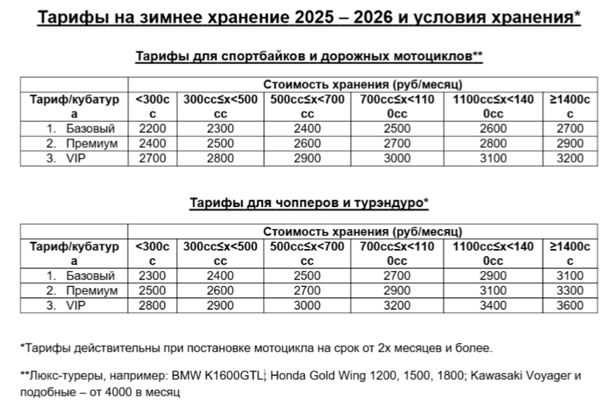 - Премиум - хранение мотоцикла в теплом помещении, мойка и обслуживание акккумулятора. Оптимальный вариант. Тариф включает в себя: